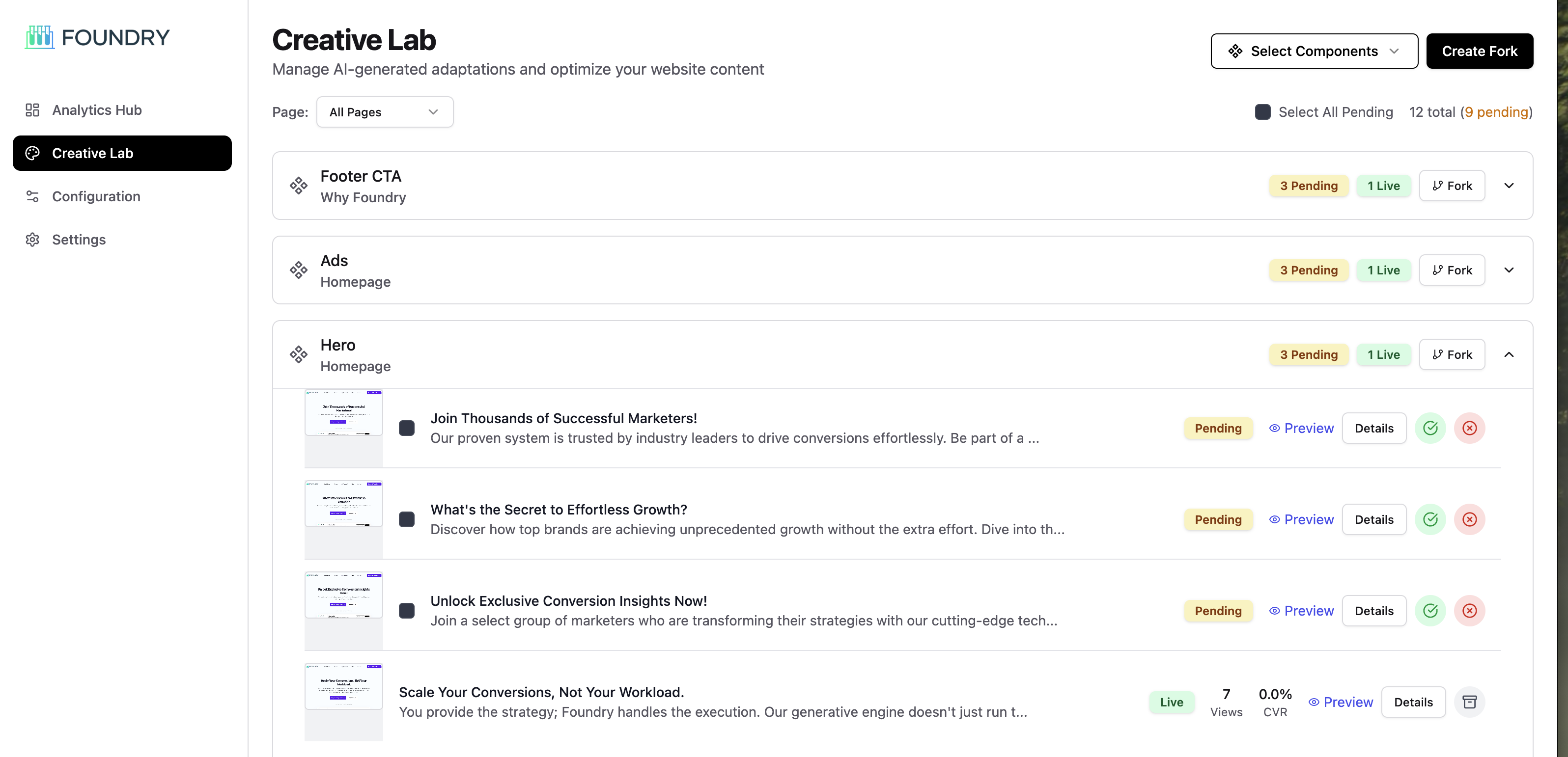 Watch as your conversion rates climb while Foundry continuously tests, learns, and optimizes. You'll get detailed analytics showing exactly which variations are driving results—all while you focus on strategy, not spreadsheets.