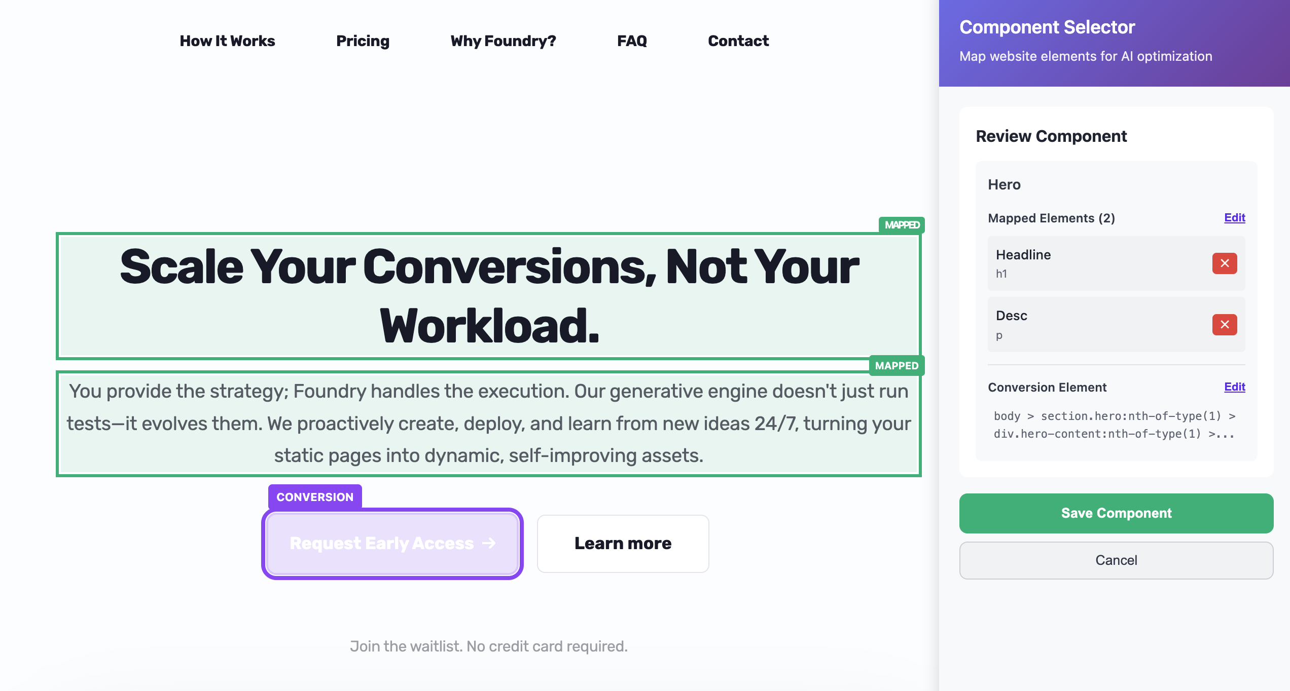 Just install our lightweight script tag, open the Foundry editor, and select the elements you want to optimize. Works on any platform—WordPress, Drupal, Framer, Webflow, custom builds, you name it. Selecting an element doesn't just highlight it; it cues our engine to analyze its role in your page's hierarchy.